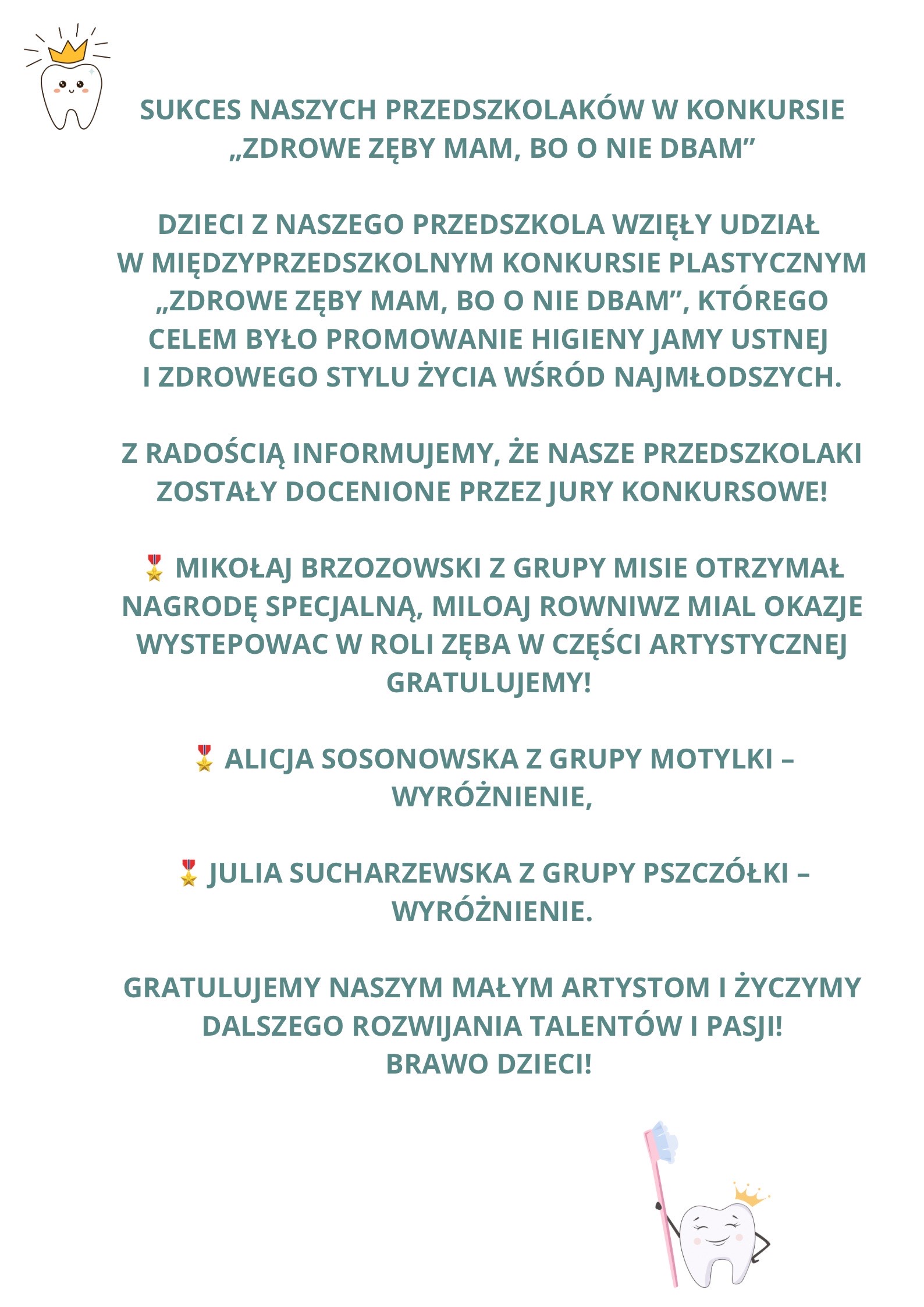 WYRÓŻNIENIE TOMKA ZASADZKIEGO W MIĘDZYPRZEDSZKOLNYM KONKURSIE FOTOGRAFICZNYM SUKCES MAI ZAREMBY W MIĘDZYPRZEDSZKOLNYM KONKURSIE TALENTÓW "MAM SUPERMOCE" IV Międzyrzedszkolny Konkurs Plastyczno-Konsumencki "Przedszkolak Mądry Konsument" SUKCES MAI NA MIĘDZYNARODOWYM TURNIEJU GIMNASTYKI ARTYSTYCZNEJ W OPOLU