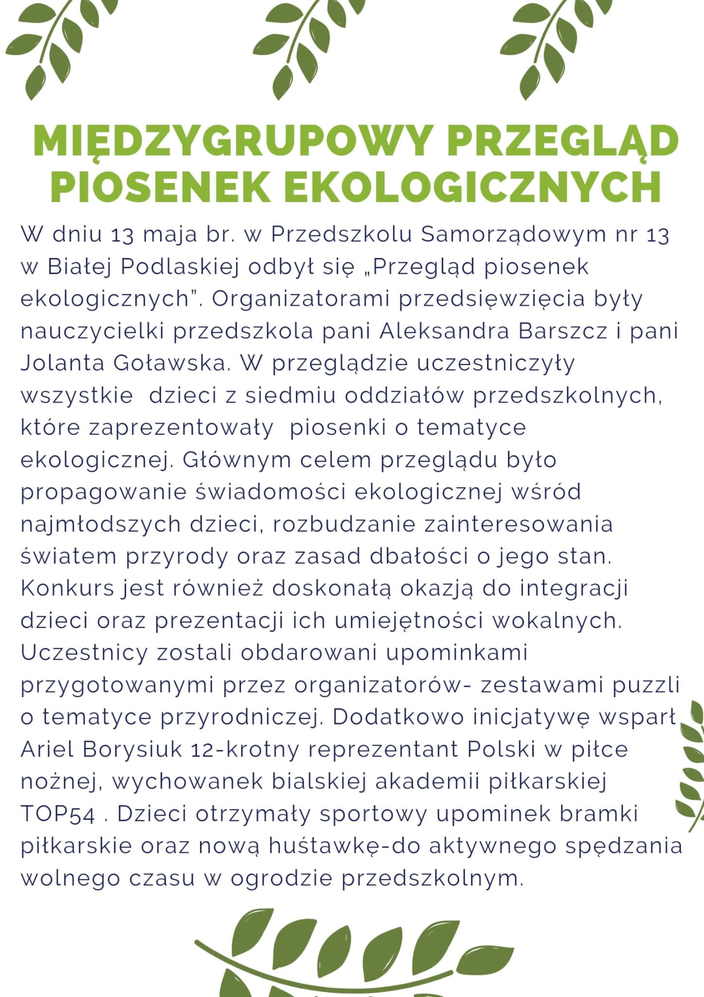 W dniu 18 maja w naszym przedszkolu odbył się „Pokaz mody patriotycznej”. Organizatorami pokazu były nauczycielki pani Iwona Chomiuk oraz pani Anna Miszkiniuk. Głównym celem przedsięwzięcia było kształtowanie poczucia tożsamości narodowej i dumy z bycia Polakiem. Dzieci wystąpiły w następujących kategoriach: