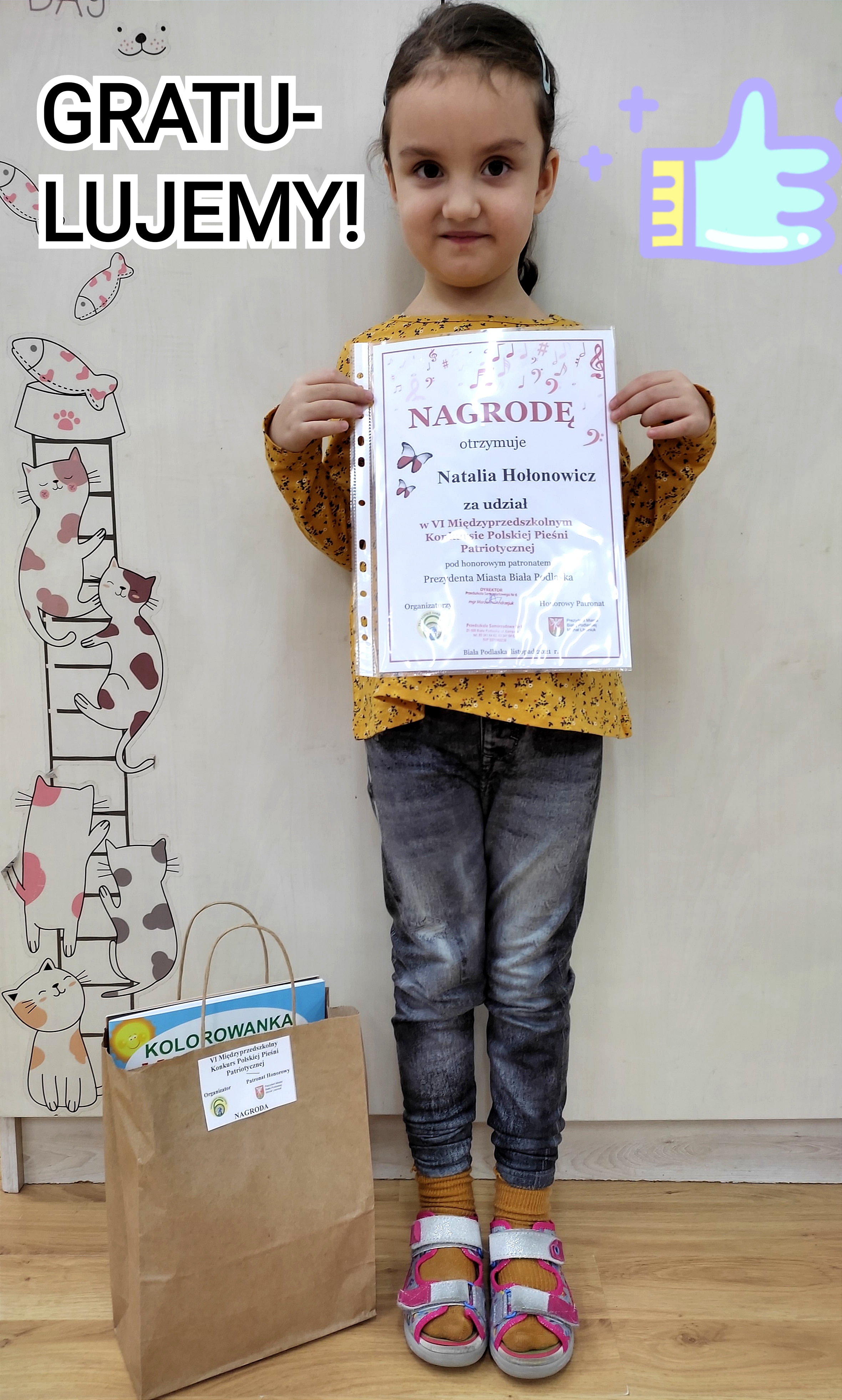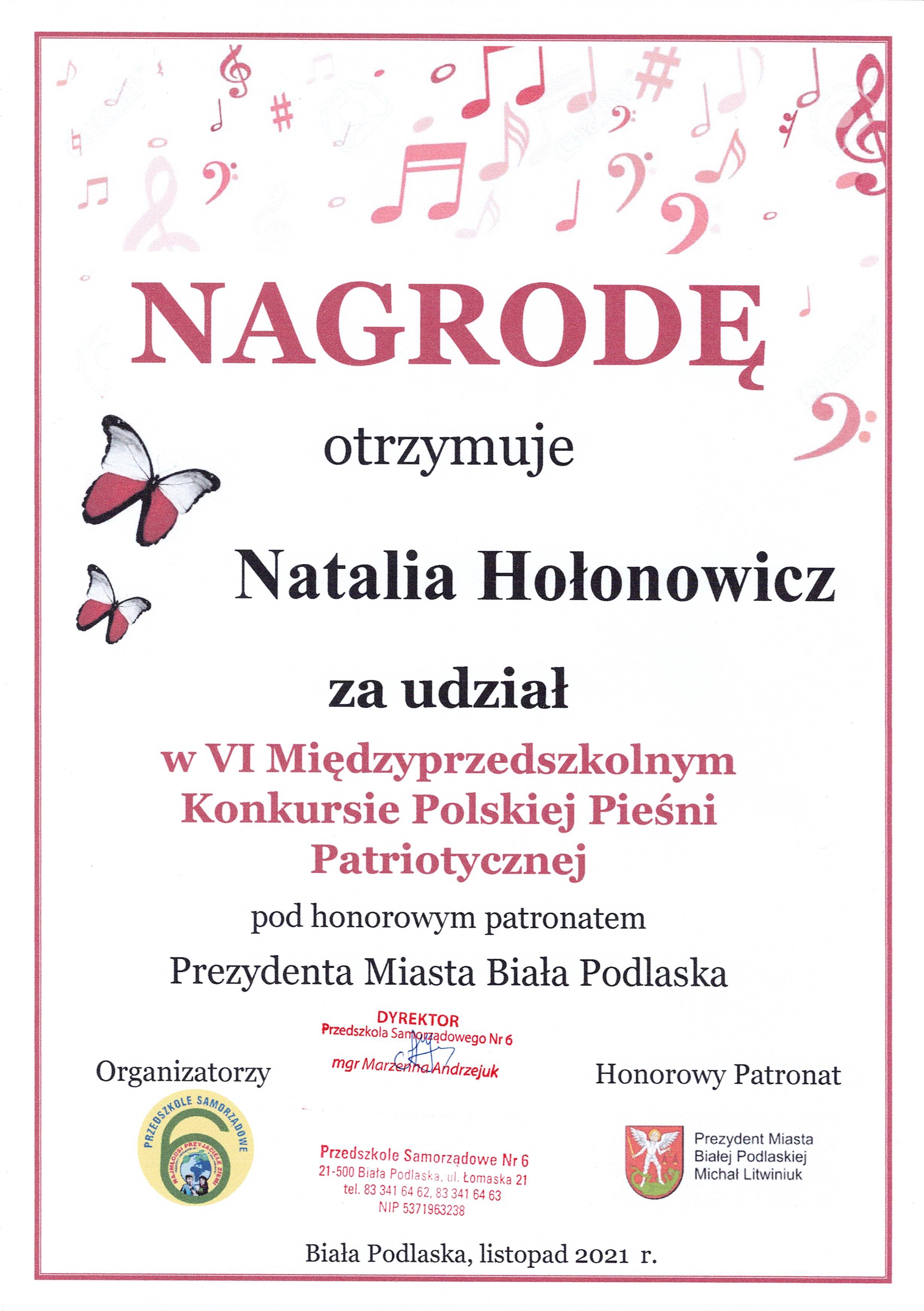 NATALKA NAGRODZONA W KONKURSIEOpublikowano: sobota, 27, listopad 2021 18:44 | Super User | Drukuj | Odsłony: 928Natalia Hołonowicz została nagrodzona w międzyprzedszkolnym konkursie Polskiej Pieśni Patriotycznej. Gratulujemy !!! "WAŻNA DATA" W WYKONANIU NATALKI poprz. nast.