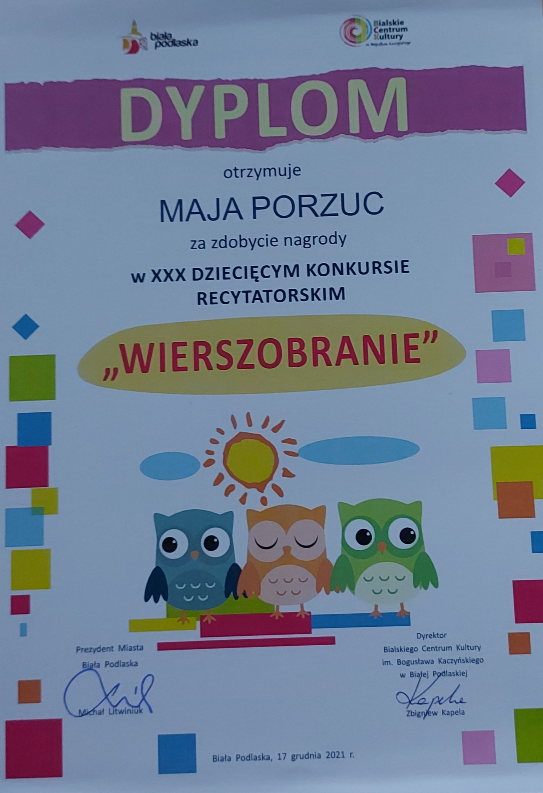 MAJA LAUREATKĄ W KONKURSIE RECYTATORSKIMOpublikowano: niedziela, 19, grudzień 2021 12:30 | Super User | Drukuj | Odsłony: 1079MAJA ZOSTAŁA LAUREATKĄ W KONKURSIE RECYTATORSKIM "WIERSZOBRANIE". GRATULUJEMY !!!! A BYŁO TO TAK ......... KLIKNIJ TUTAJ poprz. nast.