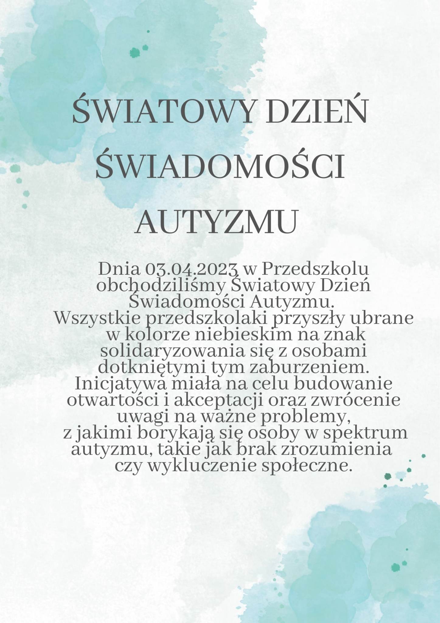 ŚWIATOWY DZIEŃ ŚWIADOMOŚCI AUTYZMUOpublikowano: wtorek, 04, kwiecień 2023 12:59 | Super User | Drukuj | Odsłony: 777
