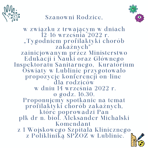 PROFILAKTYKA CHORÓB ZAKAŹNYCHOpublikowano: wtorek, 13, wrzesień 2022 13:30 | Super User | Drukuj | Odsłony: 882 LINK DO WIDEOKONFERENCJI DLA RODZICÓW: https://teams.microsoft.com/l/meetup-join/19%3ameeting_NTA0OWU0MGUtOWFlZS00ZDNiLTlmMTQtODYzYzFkOTcyYjU0%40thread.v2/0?context=%7B%22Tid%22%3A%22e006472f-3211-4ea2-a7c6-ebaa0cb3af78%22%2C%22Oid%22%3A%226a1b2b3d-b231-4191-be07-b53d2de349cb%22%2C%22IsBroadcastMeeting%22%3Atrue%2C%22role%22%3A%22a%22%7D&btype=a&role=a
