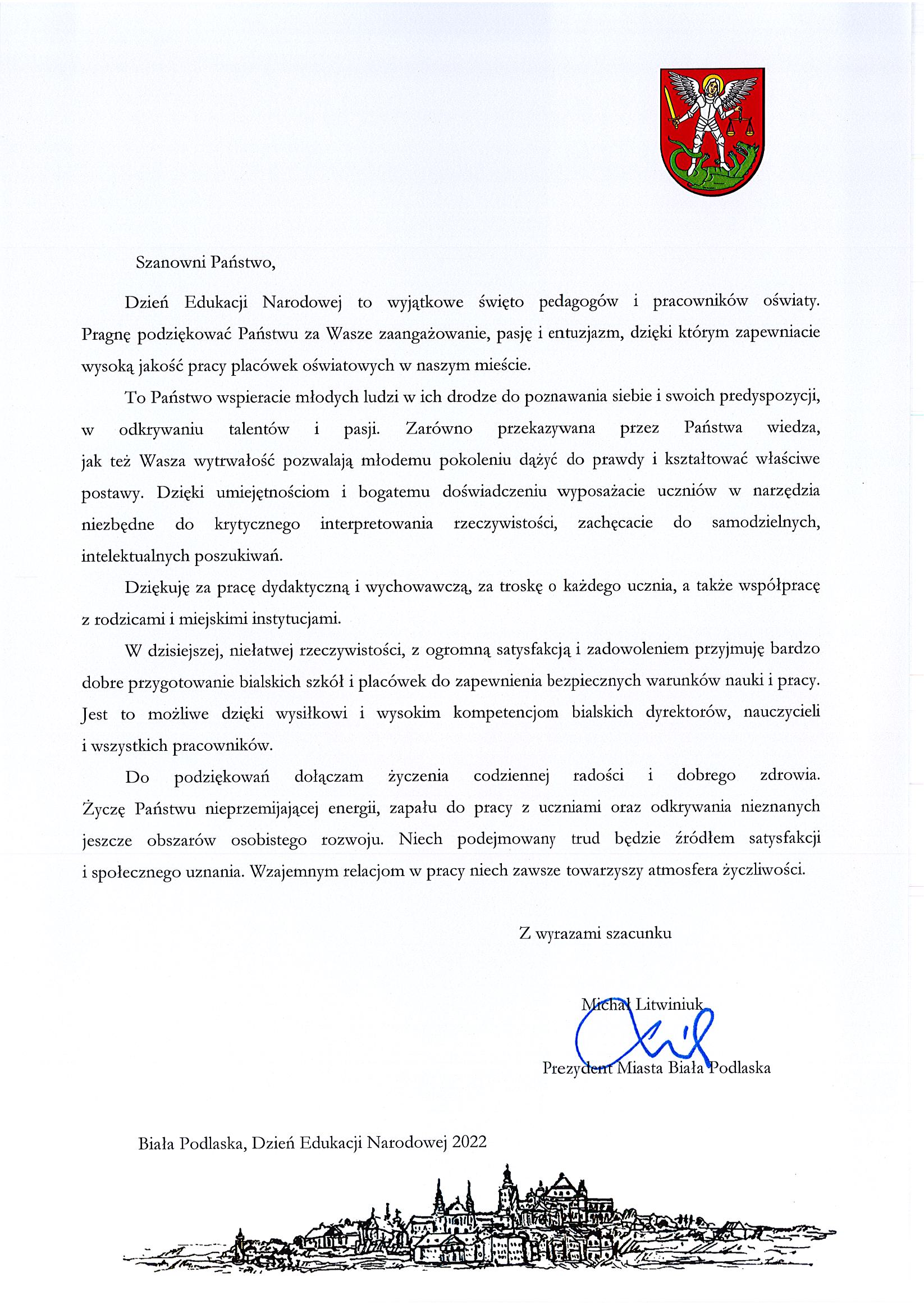 ŻYCZENIA OD PANA PREZYDENTA MIASTA BIAŁA PODLASKA MICHAŁA LITWINIUKA Opublikowano: piątek, 14, październik 2022 08:22 | Super User | Drukuj | Odsłony: 736