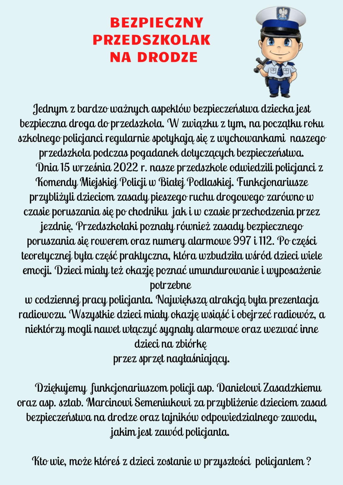 BEZPIECZNY PRZEDSZKOLAK NA DRODZEOpublikowano: poniedziałek, 19, wrzesień 2022 13:43 | Super User | Drukuj | Odsłony: 885 MEDIA O NAS: Podlasianin (kliknij tutaj)