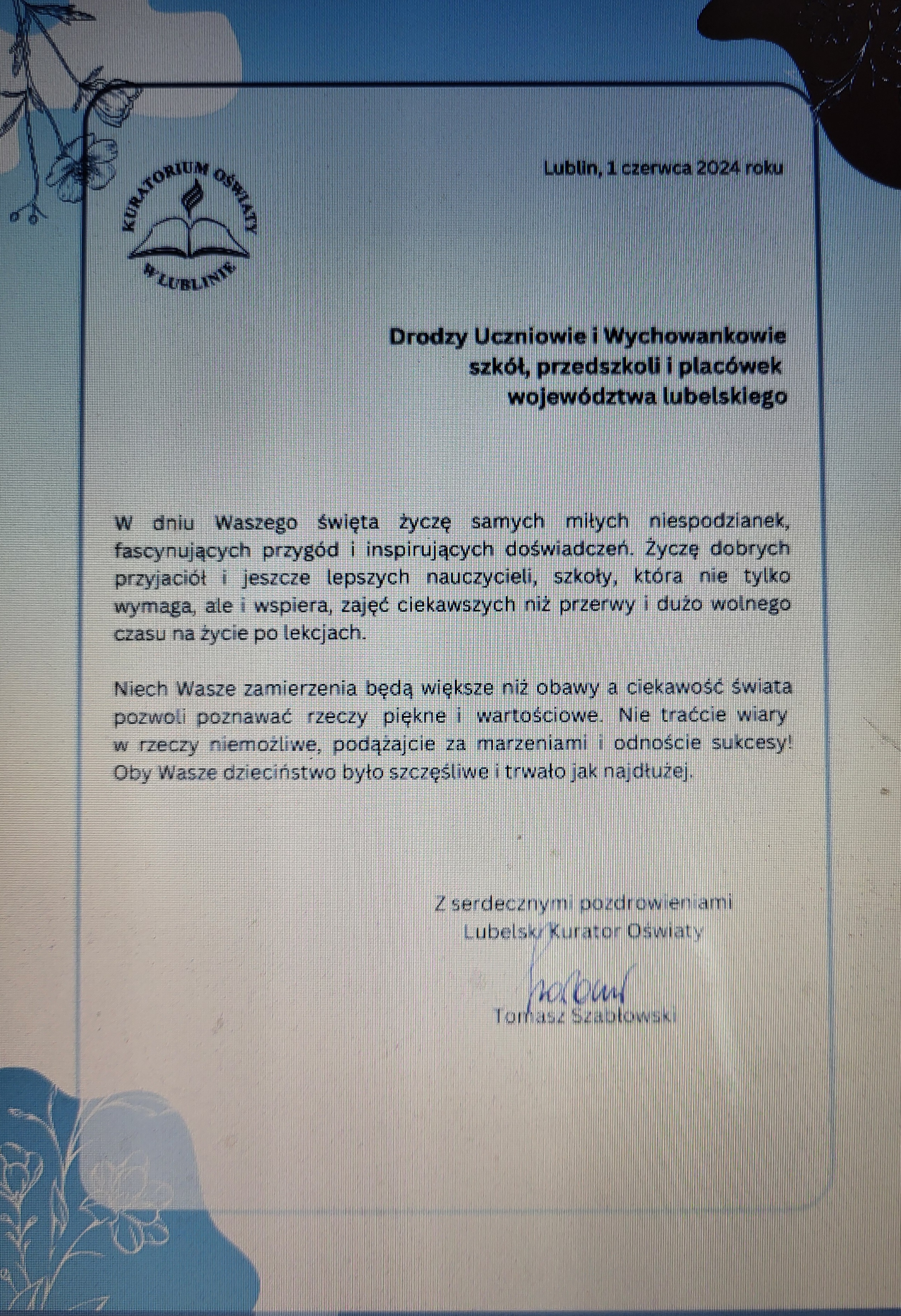Jesteś tutaj: Start Archiwum Rok 2023/2024 Aktualności ŻYCZENIA Z OKAZJI DNIA DZIECKA OD LUBELSKIEGO KURATORA OŚWIATY