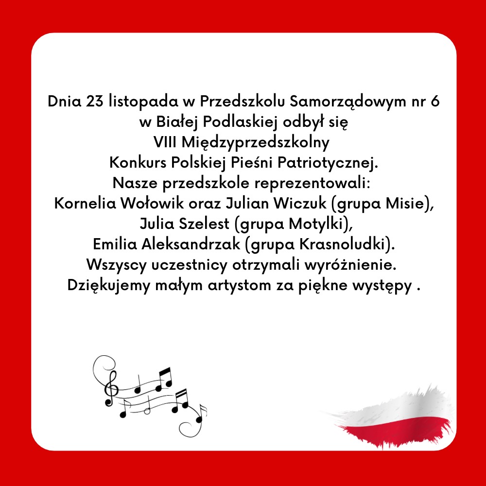 Rocznica odzyskania niepodległości jest jedną z najważniejszych dat w polskim kalendarzu, a dla milionów Polaków okazją do manifestowania patriotyzmu, przywiązania do tradycji i dumy z polskiej historii. Dlatego też 8 listopada 2023 r. w naszym przedszkolu odbyła się uroczysta akademia z okazji Narodowego Święta Niepodległości, którą przygotowały dzieci 6-lenie z grup ,,Krasnoludki” i ,,Sarenki” pod kierunkiem nauczycielek: Iwony Chomiuk, Anny Miszkiniuk, Doroty Brzozowskiej i Eweliny Sidoruk.