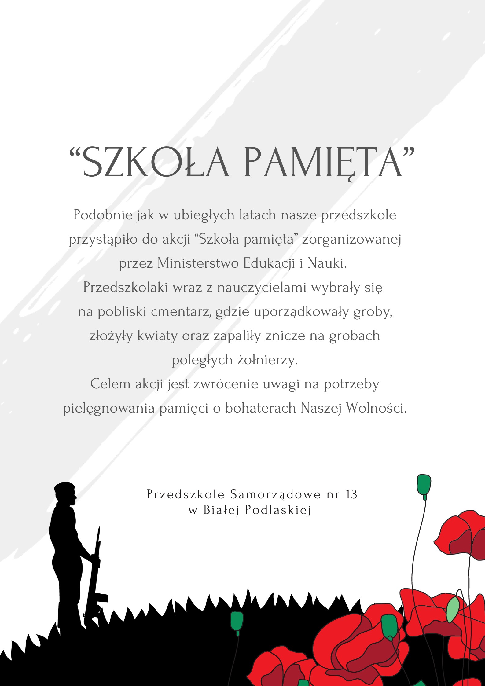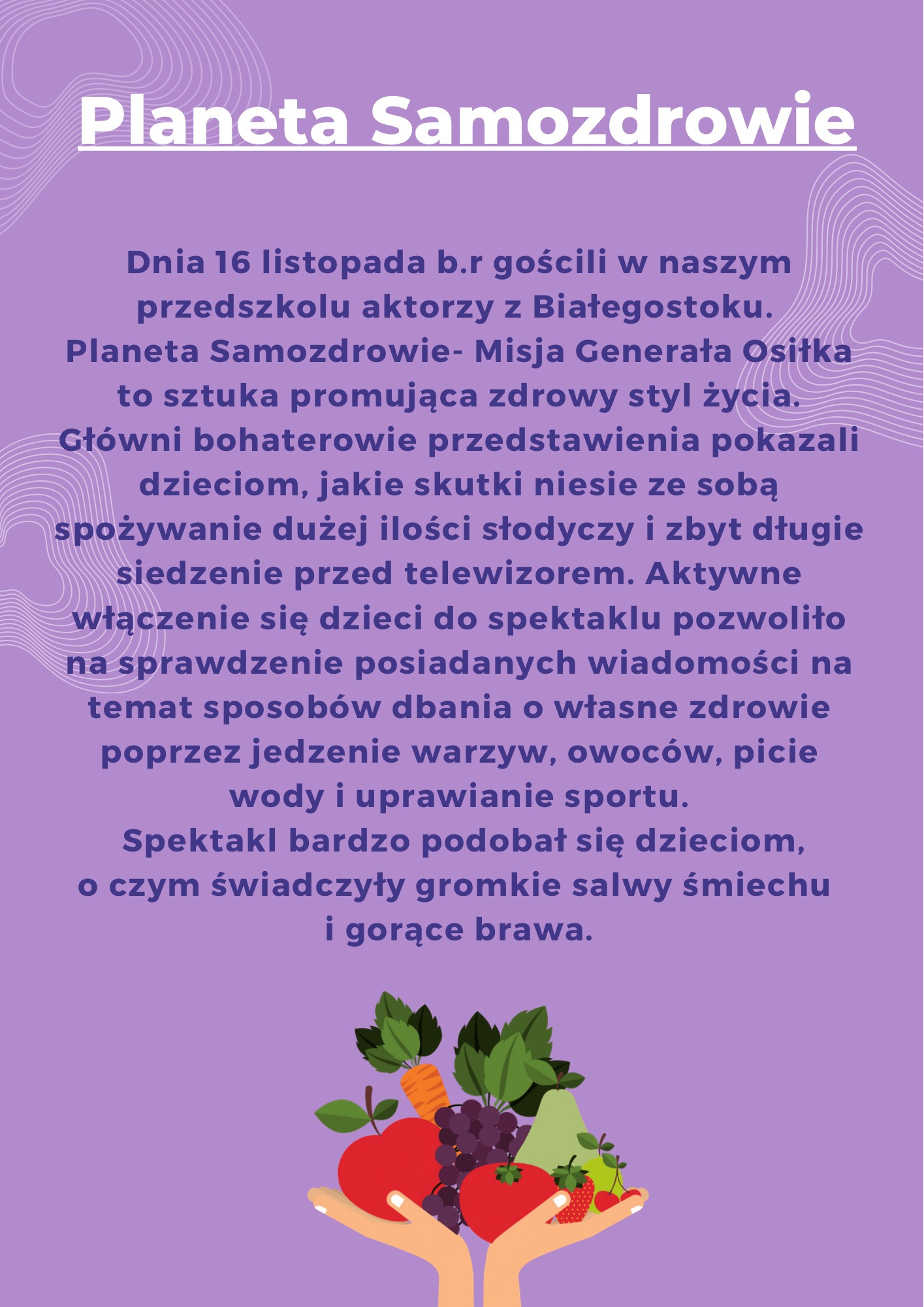 Przedszkolaki w pięknej scenerii, wierszem i piosenką, ukazały drogę Polaków ku niepodległości. Wszystkie dzieci, tego ważnego dnia były odświętnie ubrane, a na ich piersiach widniały kotyliony w barwach narodowych. Dumnie przyjmując właściwą postawę ,,na baczność” odśpiewano Hymn Polski.