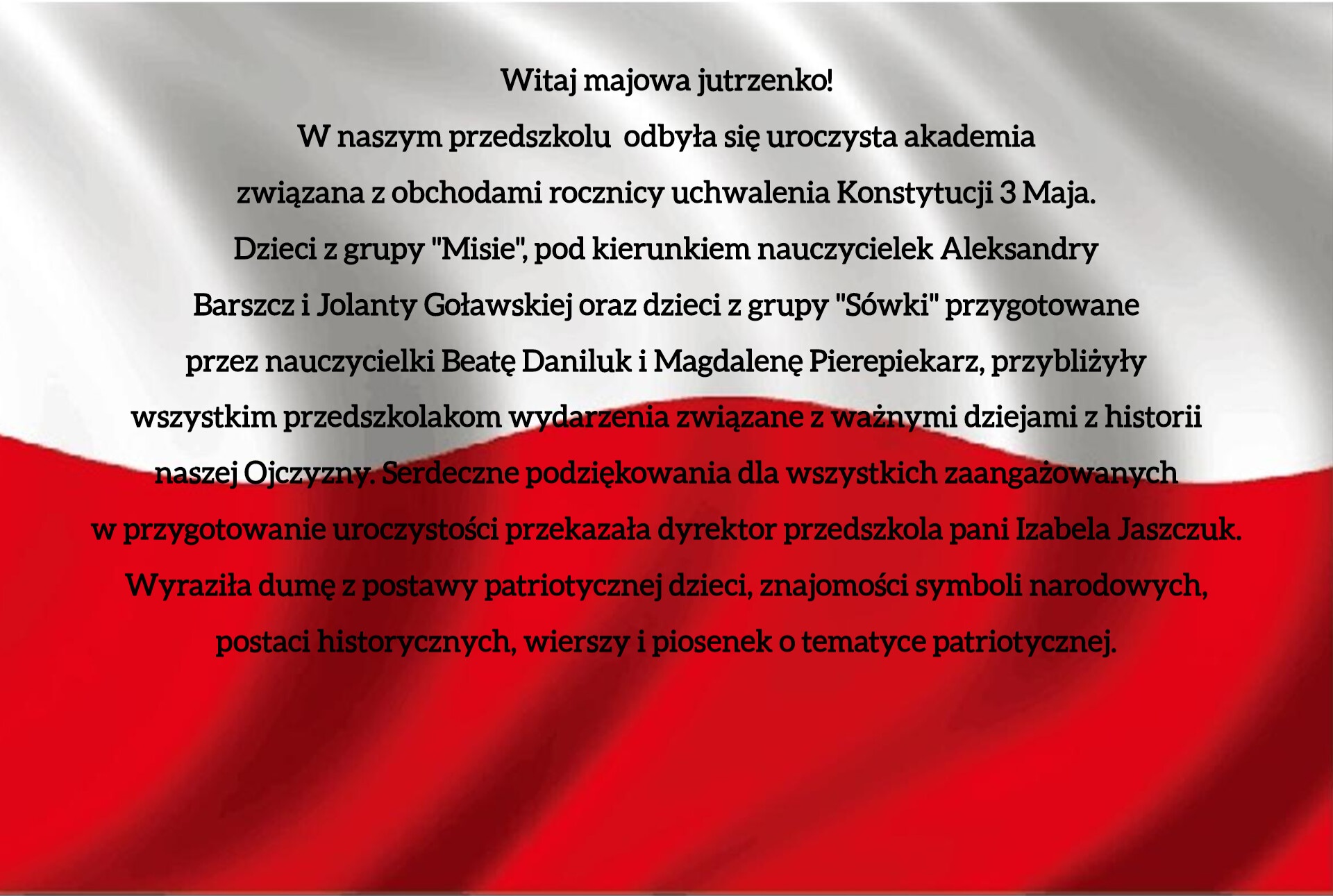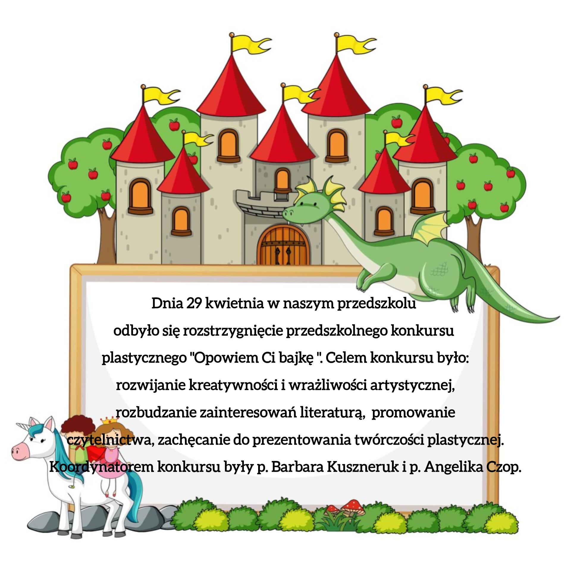 Na konkurs wpłynęło 29 prac, spośród których komisja konkursowa w składzie: dyrektor I. Jaszczuk, p. Anna Miszkiniuk i p. Jolanta Goławska wyłoniła zwycięzców przyznając I, II i III miejsce w dwóch kategoriach wiekowych: 3-4 latki oraz 5-6 latki. Przyznano również dwa wyróżnienia.