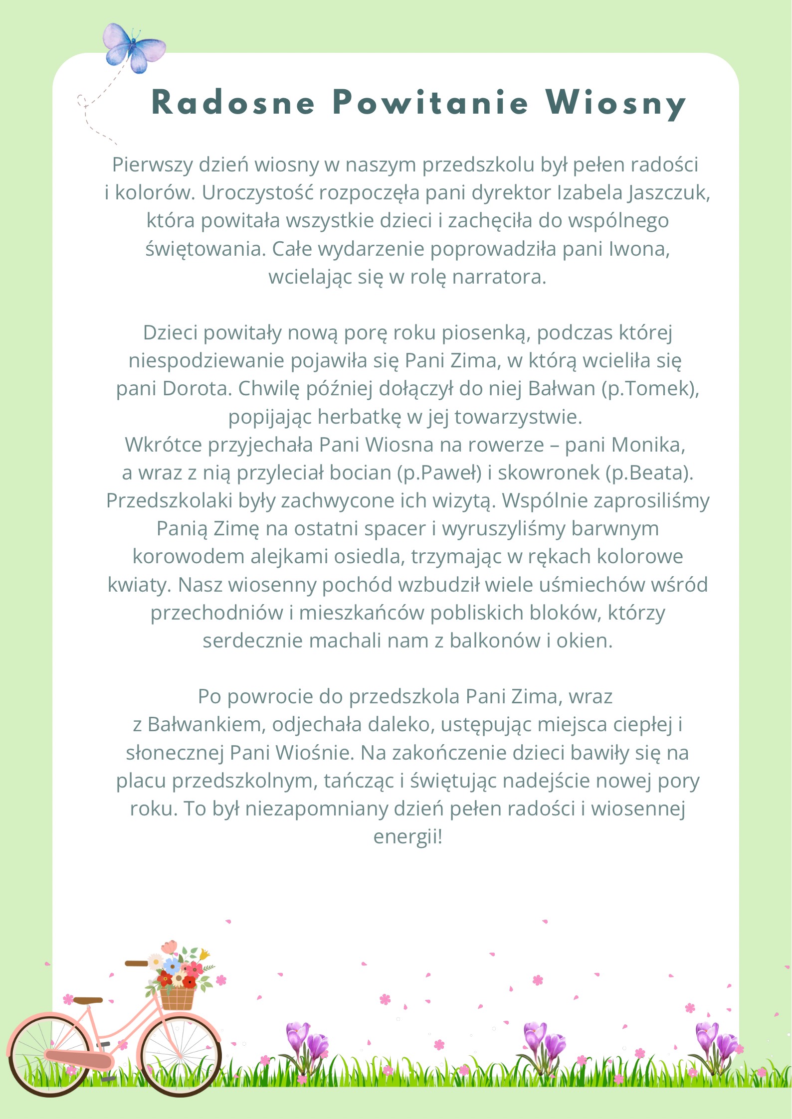 POWITANIE WIOSNYOpublikowano: piątek, 21, marzec 2025 21:11 | Super User | Drukuj | Odsłony: 540 ZAPRASZAMY DO OBEJRZENIA FILMU MEDIA O NAS (kliknij tutaj)